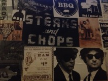 For décor, Dawn had a huge black animal skin for the wall next to the bar, and above the dining room banquet, we now had room to install a 40’ collage of funny vintage BBQ ads & images to create a focal point for the space. Special thanks to artist & graphic designer Kevin Burke for helping select and reproduce the images. We went with black & white and sepia ink output, printed on warm creamy paper. Big shout out to my friend Beth Fraher as well, my fun & helpful assistant. We got cookin’ and banged this job out in 3-4 hours. The effect is amazing; it seriously looks like it has been there for years. Some of the images are LOL funny, and a bit edgy, setting the perfect tone.