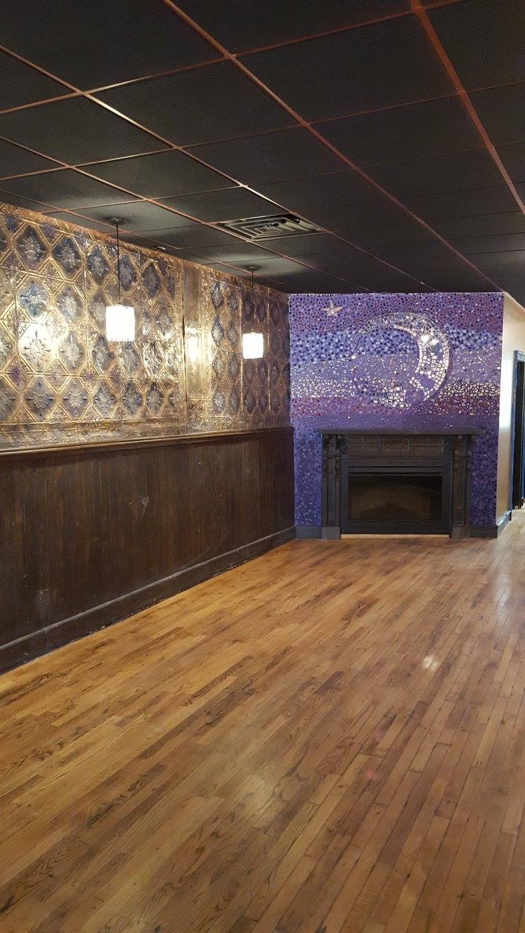 Working with local artists to give the venue a unique flair, Moondog’s is a welcoming funky lounge. As a focal point, on the fireplace wall, we created a lovely mosaic featuring an evening sky, crescent moon & star with Lynn and her close friends. I matched the purple grout color to the stage carpeting, and our friend Roxy had some interesting jewelry pieces that we mixed into the moon shape, along with the broken tile & mirror. Other artists did paintings and renderings of the logo to provide those special touches that make the space its own.