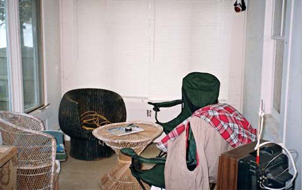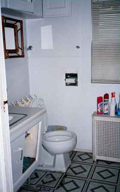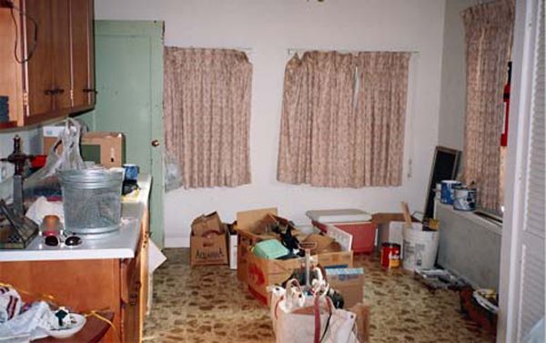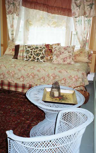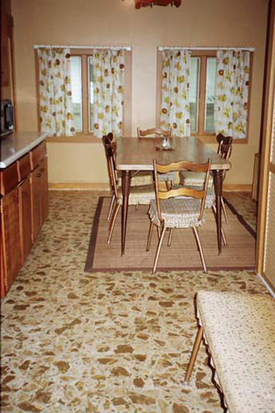 For furniture, I found some treasures in the owner’s basement that were easily rehabilitated, providing a very affordable solution. We bought new rugs, and I provided custom kitsch window treatments and artwork. Although it needed to feel more inviting, I didn’t work against the retro feel that the cottage had. The floor covering in the kitchen was classic, so we went with it, and I faux wood grained the refrigerator and the stove to top it off!